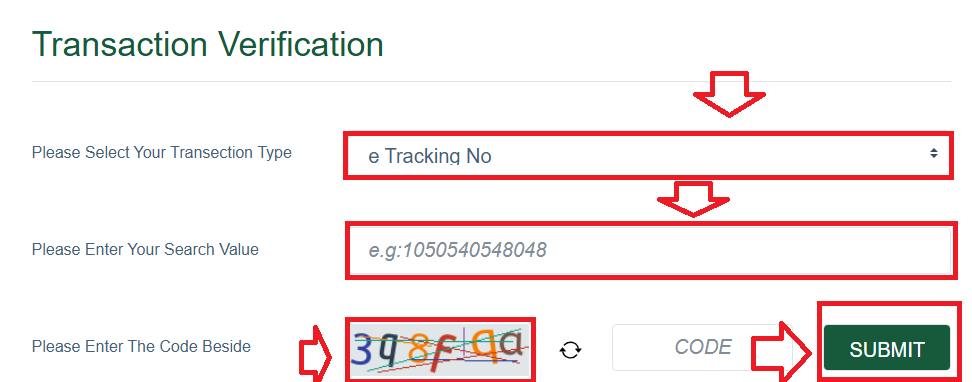 From the dropdown menu, select either E-Tracking Number or Transaction Number under the “Transaction Type” field. - Enter Your Reference Number